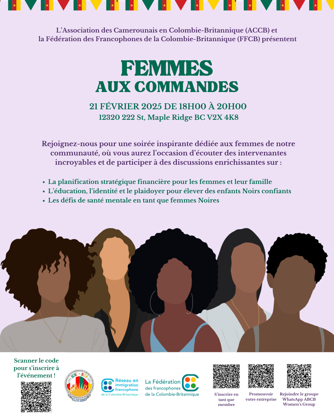 L’Association des Camerounais en Colombie-Britannique vous invite à son événement « Femmes aux commandes ». Venez écouter des interventions inspirantes de femmes sur une variété de sujets essentiels, tels que la santé mentale et la planification financière. Cette soirée sera l’occasion de découvrir des perspectives enrichissantes et d’approfondir les discussions grâce à des échanges interactifs entre les participantes et participants.