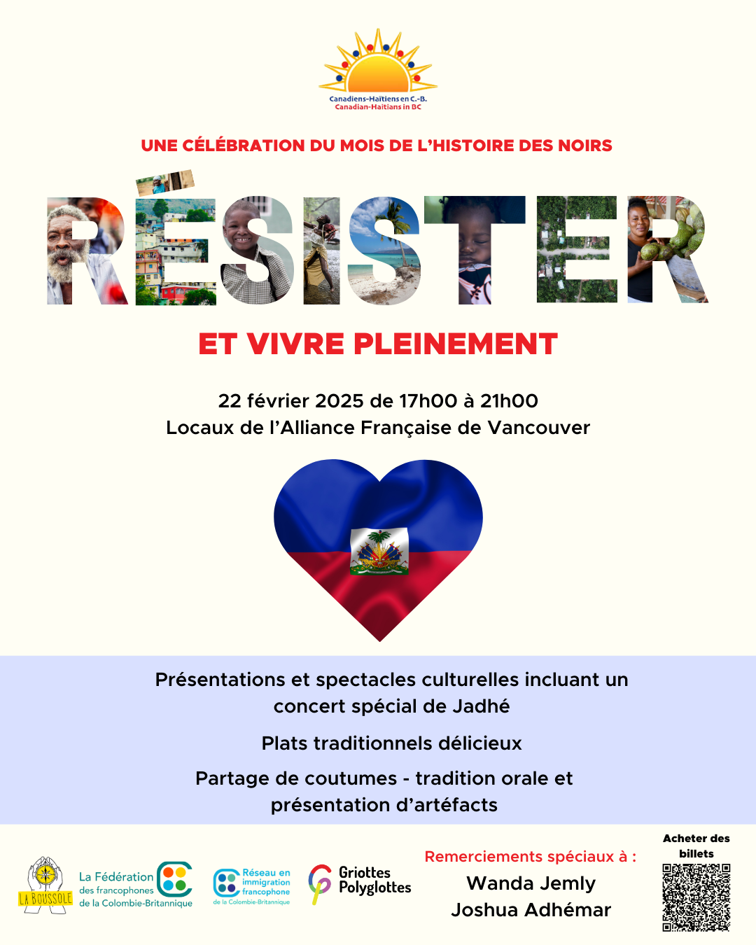 L’Association culturelle Canado-Haïtienne de la C.-B. organise une célébration spéciale « Résister et vivre pleinment ». Toute la communauté est bienvenue pour célébrer la culture haïtienne autour de la musique, des traditions et des plats délicieux. Ceci est un événement payant.