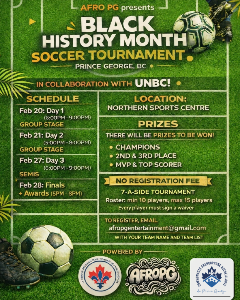 La Communauté francophone accueillante de Prince George organise, en partenariat avec l’AFROPG, un tournoi de football. Que vous soyez pratiquant·e ou supporteur·trice, rejoignez cette activité sportive et communautaire visant à rassembler les communautés, célébrer la diversité et promouvoir les valeurs de solidarité, d’inclusion et de vivre-ensemble.