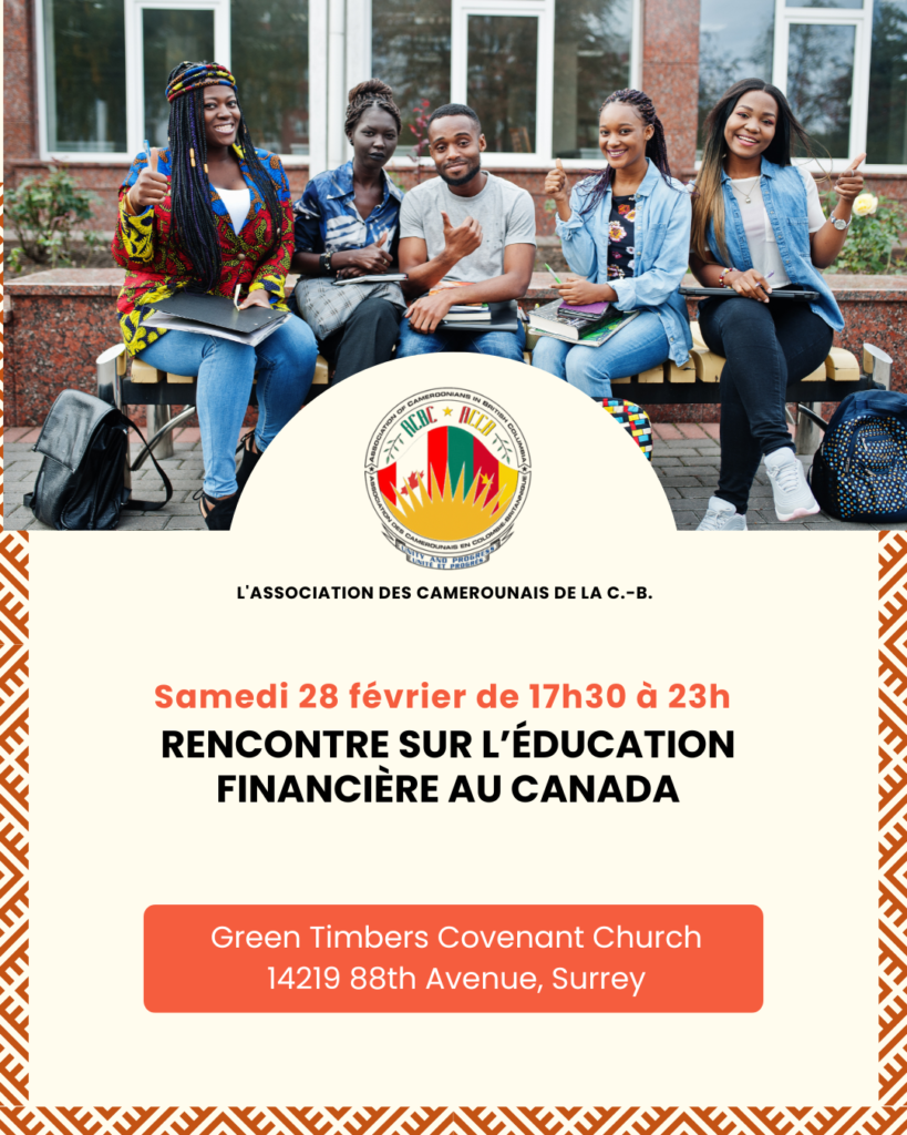 Association des Camerounais de la C.-B. vous invite à une rencontre sur l’éducation financière au Canada. Au programme : compréhension du système bancaire, cartes de crédit, credit score, taux d’intérêt et bases essentielles pour mieux gérer ses finances. Un volet sera également consacré à la santé mentale, notamment l’impact du stress financier et les ressources de soutien disponibles au Canada.