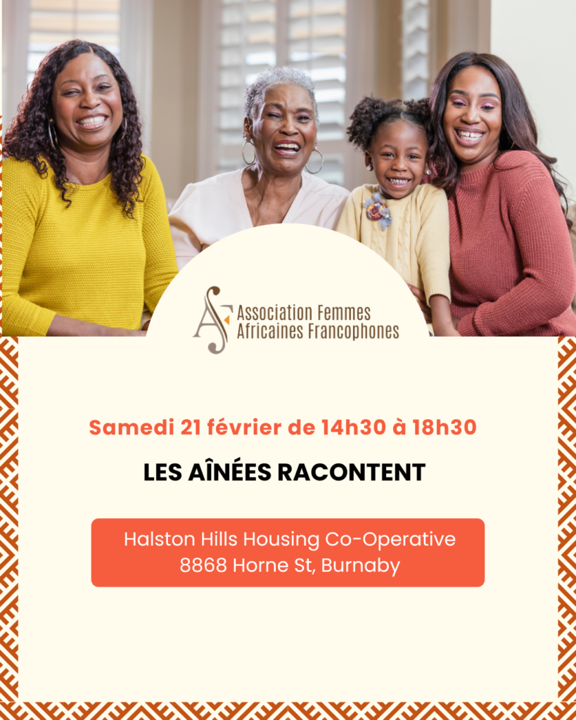 L’Association Femmes Africaines Francophones (AFAF) vous invite à sa rencontre : Les Aînées racontent. L’objectif est de favoriser la transmission intergénérationnelle et l’autonomisation des jeunes femmes noires francophones à travers le partage des parcours, des défis et des apprentissages des femmes