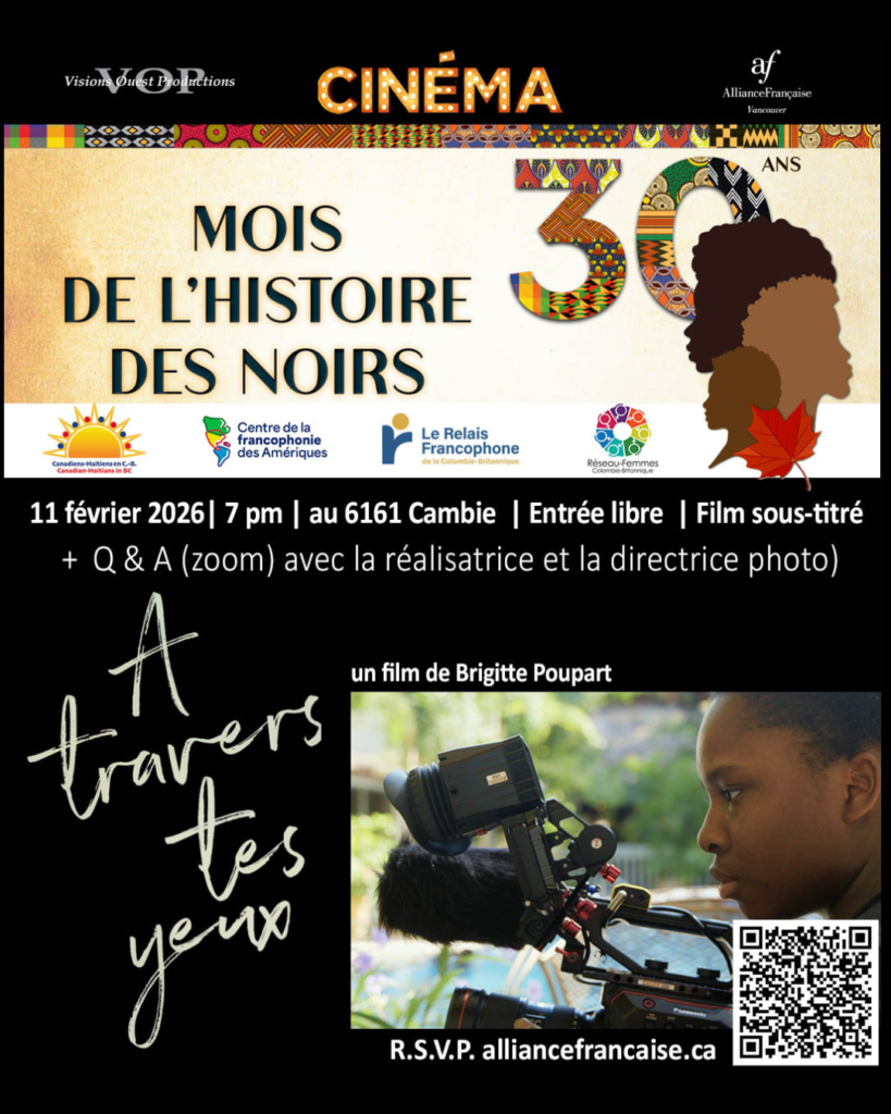 Visions Ouest Productions, l’Alliance Française Vancouver (AFV), l’Association canado-culturelle haïtienne (ACCH), le Centre de la francophonie des Amériques, Le Relais francophone et Réseau-Femmes C.-B. présentent, dans le cadre du Mois de l’histoire des Noirs, le film documentaire A TRAVERS TES YEUX de la réalisatrice québécoise Brigitte Poupart